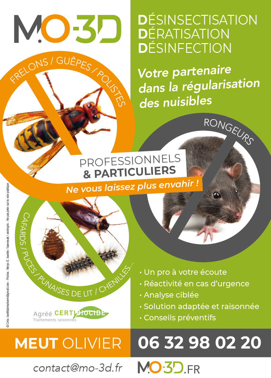 En quelques mots: Ces petites bêtes s’avèrent très envahissantes et ce multiplient rapidement dans vos bâtiments, locaux, zone de stockages habitations, grenier, caves… Elles causent d’importants dégâts matériels et posent de véritables problèmes de santé et d’insalubrité. C’est pour cela qu’il faut agir rapidement avant l’infestation. Un professionnel à votre écoute. Une analyse de votre problématique, des conseils afin de limiter leurs retours. Un traitement de lutte contre les nuisibles efficaces avec des solutions raisonnées ! Je suis Olivier de l’entreprise MO-3D, partenaire de nombreuses mairies, GDS 01 , Communautés de communes et d’entreprises…